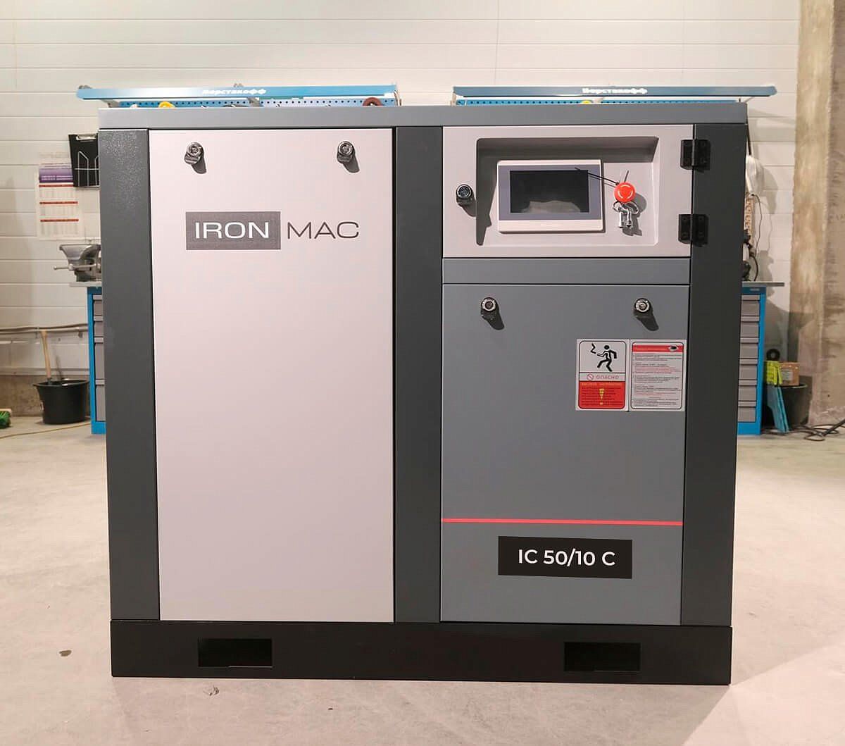 Винтовой компрессор IronMac IC C из профессиональной линейки, собран на прочной стальной раме. Компрессор предназначен для малых и средних предприятий, а все узлы конструкции фиксируются к жесткому основанию и дополнительно изолируются от вибраций. На серии IC C реализована система привода - муфта, а двигатель имеет уровень защиты по классу IP55 с высокой степенью эффективности отведения тепла.